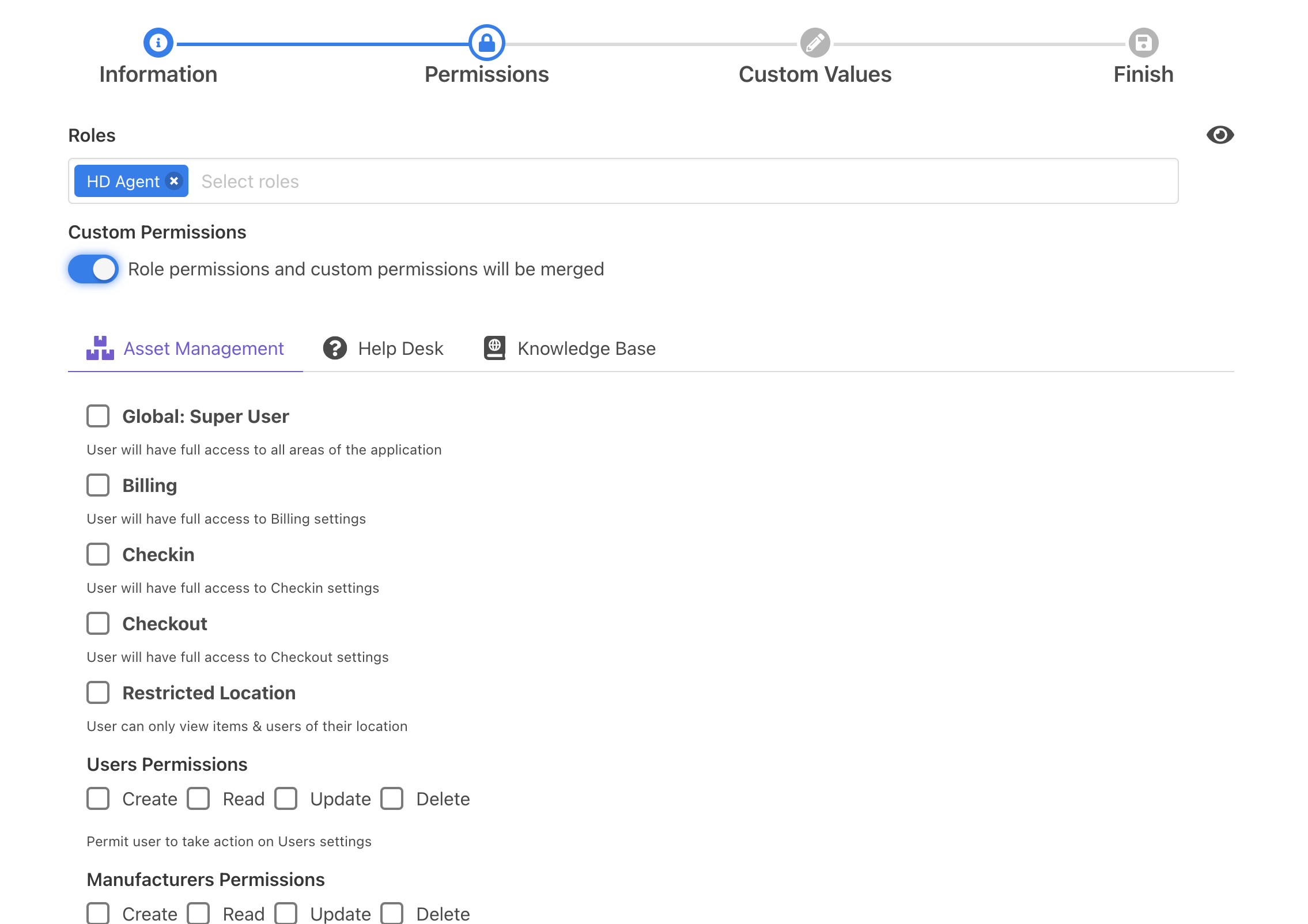 In the second screen, you will be prompted to select your users role if you choose to do so. These roles can be preset. You can customized your user's permissions on the current screen, or choose a role and customize your user's permissions. If you have more than one feature; such as Asset Management and Help Desk, make sure you select each tab to select permissions if choosing Custom Permissions.