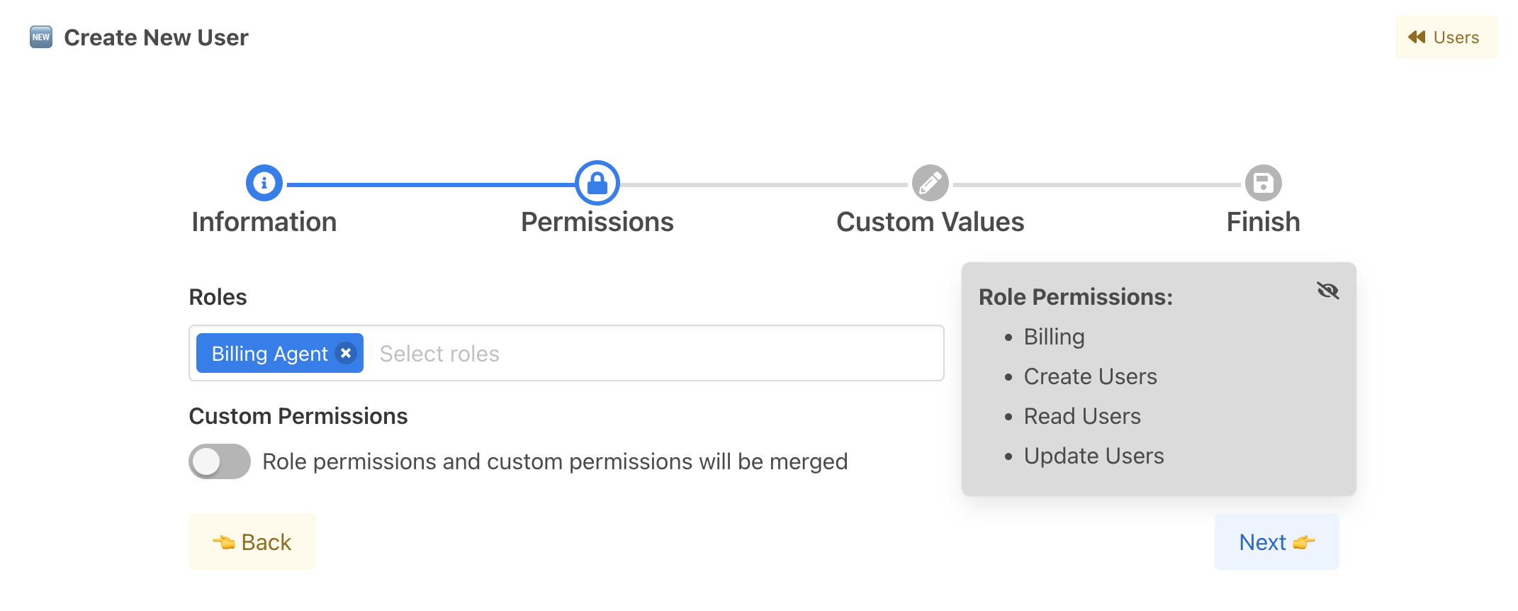 3. Select the role the user is assigned to. You can click the "eye" icon to see what the user will have permissions for in this role. If this user needs to have additional permissions, toggle the custom permissions and select any other permissions they need. Click "Next" to move on to "Custom Values".