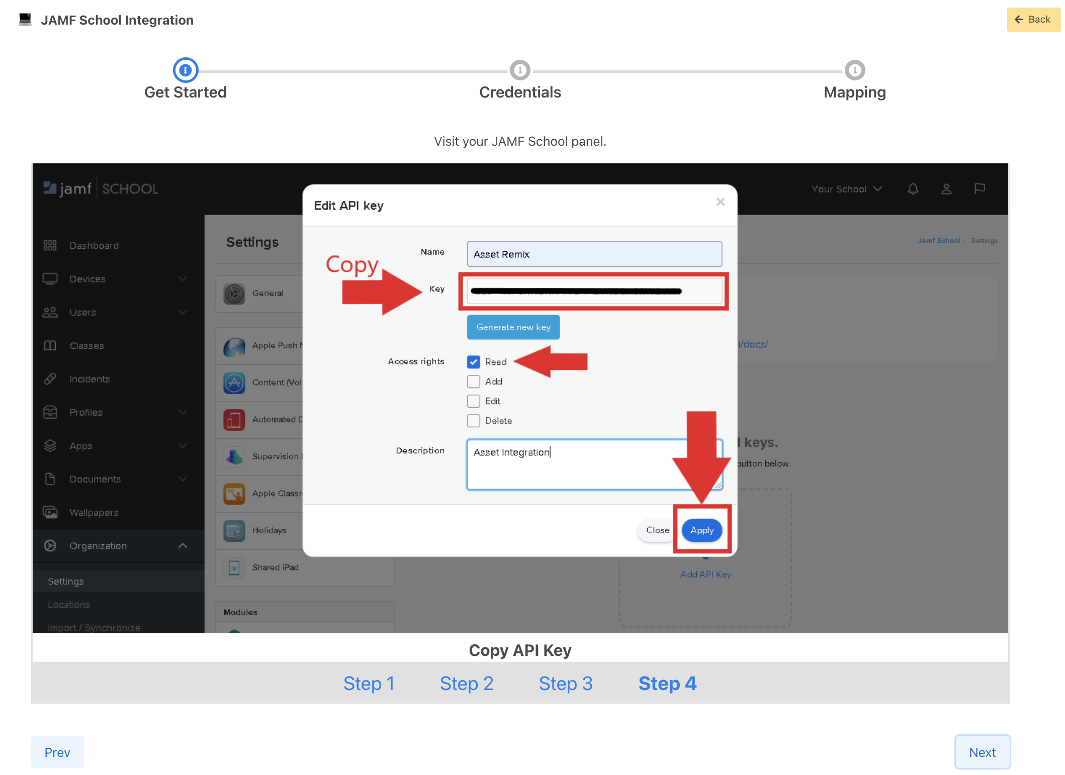 4. Name your API key, make sure a Key has been generated. Select **"Read"** and give the key a description.