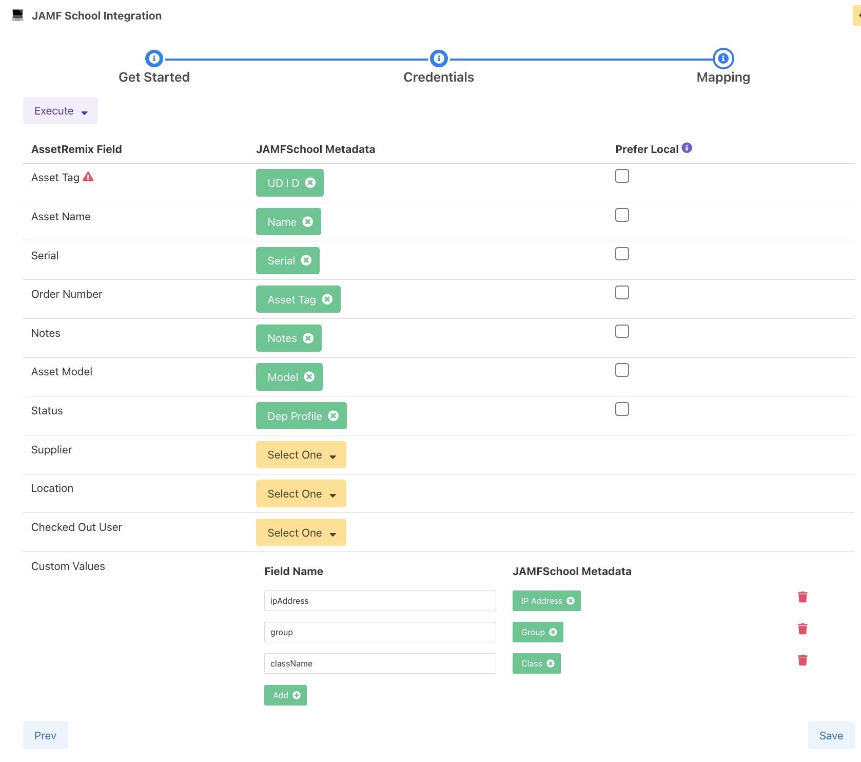 6. Select the JAMF School Metadata you would like for the AssetRemix fields. You can also select the **"Prefer Local"** box if you'd like the data to be ignored in an update. Click **"Save"** to complete the integration.